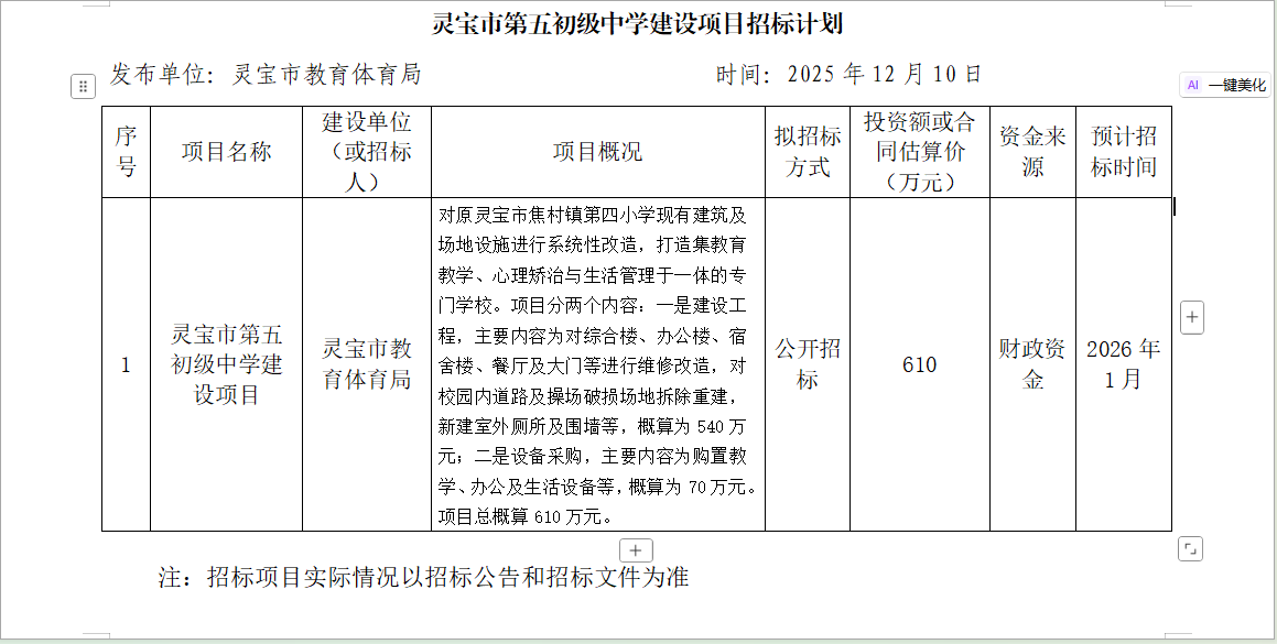 灵宝市第五初级中学建设项目招标计划